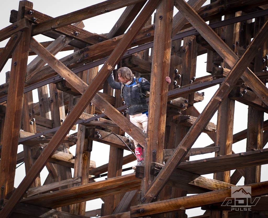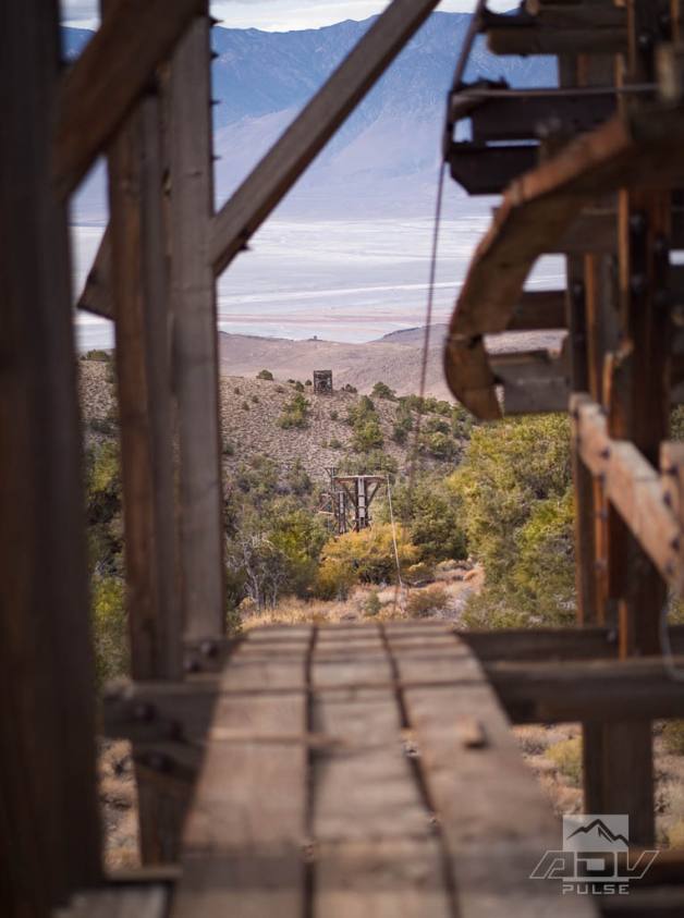 Well above Cerro Gordo is another trail you’d likely miss without a GPS to show you where it is. The entrance to the Belmont Mine single track is entirely vague, and with no wheel tracks ahead of us, it took a moment to spot the gap between the trees which led to a hint of a path. More than once, the drastic switchbacks would sneak up and not be seen until you’d already passed the turning point. Given the extreme nature of this path carved into the side of a massive mountain, it was more than a little surprising to see leftover structures from a mine on this narrow descent. Only after passing the Belmont Mine was it realized this was the same route we had tried to do in reverse just a few weeks earlier, and were stopped by what we thought was a landslide, but may have very well been an overgrown tailing pile, or perhaps a combo pack of the two things. Either way, climbing this trail is not something I’d ever recommend attempting on a loaded-up adventure bike.